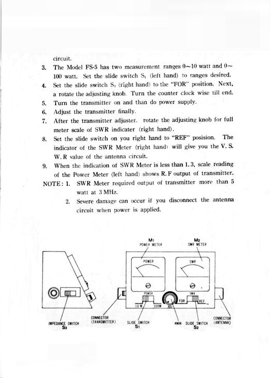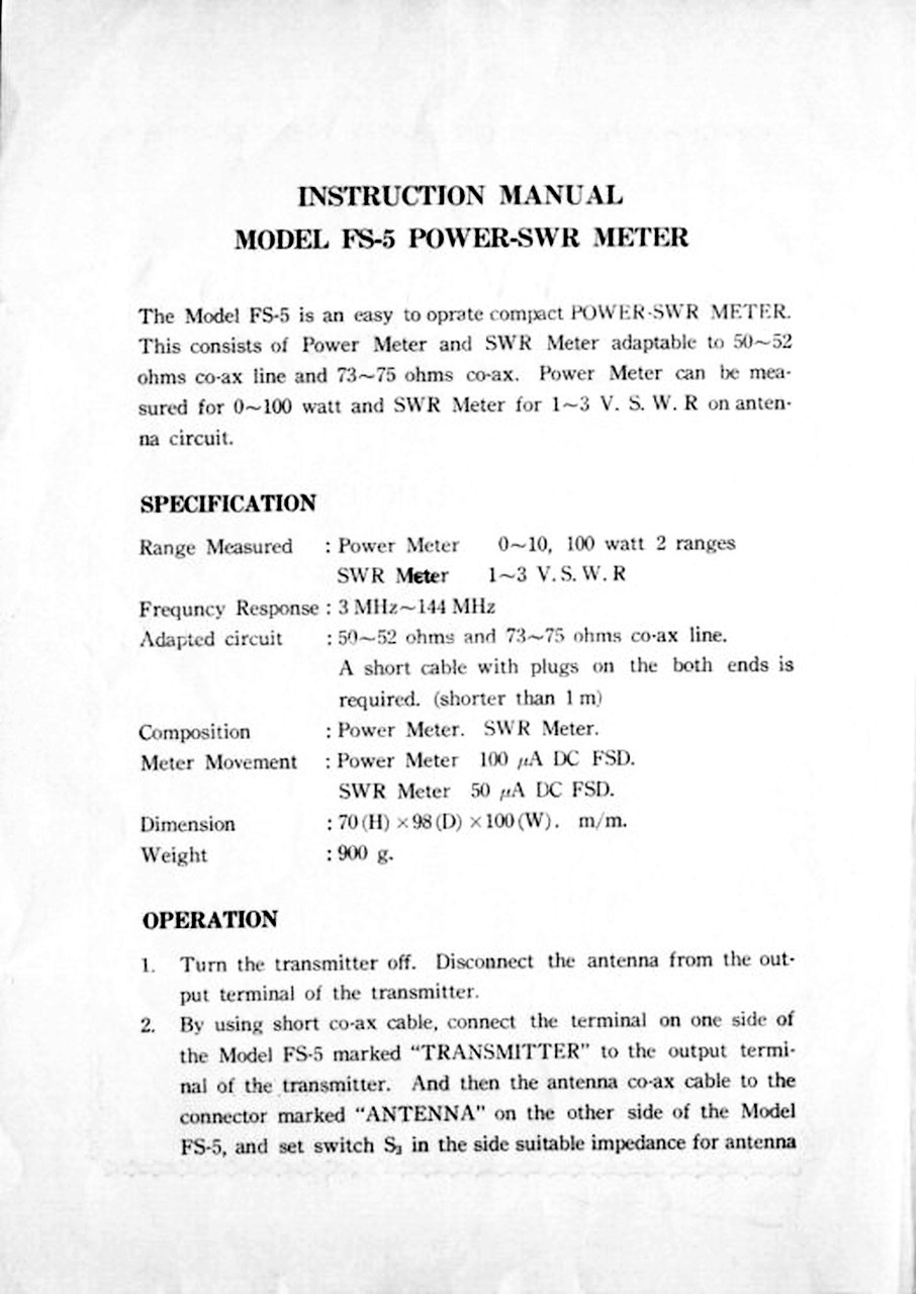 The instrument measures Standing Wave Ratio (SWR) and RF power in the range of 3 to 144 MHz with two power measurement ranges: 0 to 10 and 0 to 100 Watts. The FS-5 is equipped with separate instruments for measuring Standing Waves and RF Power. On the left side is the SO-239 connector for connecting the transmitter and the switch for selecting the antenna impedance: 52 or 75 Ohms. On the front panel, on the left, is the power meter; on the right, the Standing Wave meter. At the bottom of the front panel is the switch for selecting the two power measurement ranges: 10 or 100 watts. In the center is the knob for adjusting the Standing Wave full scale by selecting "FOR" (Forward) on the right switch, and then selecting "REF" to read the reflected power. On the right side of the instrument is another SO-239 connector for connecting the antenna. The FS-5 measures: 3.9 x 2.8 x 3.9 inch and the weight is: 1 lb 15.7 oz. This was my first SWR meter, purchased new in the early 1970s and used for a long time before I finally got my hands on a fantastic Osker Block SWR-200. © IK3HIA, 2004. |