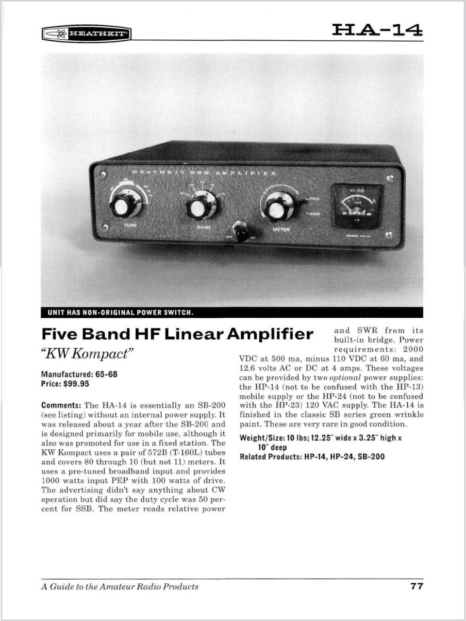 In the 60s, Heathkit was at the height of its success, its kits were very popular in the United States but they were also popular in Europe and in many other countries in the world because the assembly boxes were complete with everything that could be needed to build the equipment and the instructions were so detailed that they even explained how to remove the insulation from the copper wires (provided in the kit) and how to solder them in the circuit. The HA-14 was no exception to the rule and after having assembled it and performed the essential calibration (explained in detail in the manual provided with the kit) you came into possession of a compact amplifier that provided truly exceptional performance. The amplifier used two 572A triode valves working in parallel, the maximum power that could be applied to the input was 100 W and 1000 Watts PEP in SSB were obtained at the output. The frequency bands covered were: 80, 40, 20, 15, 10 meters and the accepted antenna impedance ranged from 50 to 75 OHm. Depending on the Heathkit power supply used, the power supply could be via the mains or with a 12 V or 24 V vehicle battery. The HP-24 (AC) power supply could be set up for 120 Vac or 220 Vac power supply by soldering two jumpers. The HA-14 was compact in size: 12.25 x 3.25 x 10 inches / 31 x 8.3 x 25.4 cm and weighed 4.5 kg / 9 lb 14.6 oz (amplifier only). The photo shows the HP-24 power supply (220Vac) that supplied the HA-14 with 2000 Vdc for the anode, 12.5 V ac for the filaments and 150 Vdc for the bias. The dimensions were 9 x 4.75 x 6.75 inches / 229 x 121 x 171 mm and the weight was 8.7 kg / 19 lb 2.6 oz. © IK3HIA - 2016. |