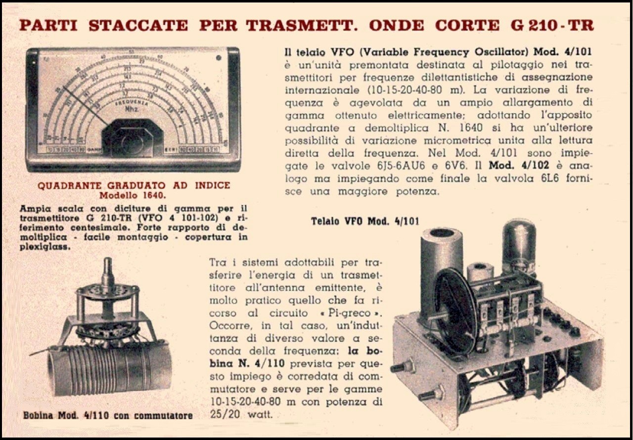 Trasmettitore radio appositamente progettato per uso amatoriale, la potenza di uscita è di 25 W in AM e CW, con modulazione AM al 100% (il modulatore ha due valvole 6L6G in push-pull). In CW il G210 trasmette con la manipolazione catodica dell'amplificatrice finale a RF (un tetrodo a fascio 807). Il VFO adottato è del tipo "Clapp" (mod. 4/101), che permette un'eccellente stabilità in frequenza, ha circuito separatore a larga banda e un circuito driver. Lo stadio amplificatore di potenza a RF è potenziato da un tubo a fascio 807 e da un filtro a P-greco (mod. 4/110) che permette una vasta gamma di accordo su varie impedenze d'antenna. Il G-210 trasmette su cinque bande amatoriali: 10 - 15 - 20 - 40 e 80 metri. Le valvole utilizzate sono dieci: sezione RF: 6J5, 6AU6, 6V6GT, 807, 83; sezione audio 6SJ7, 6SL7, 6L6G, 6L6G, 5V4G. Il microfono da collegare al trasmettitore è piezoelettrico, ad esempio il modello Geloso M-40 da palmo o il B 80/1100 da tavolo. Il mobile del trasmettitore è in ferro smaltato a forma di parallelepipedo e ha dimensioni: 52 x 25 x 26 cm, il peso dell'apparato è di 20 kg. Acquistai il G210 da un anziano radioamatore nel 1968 che me lo vendette per poche lire perché non lo utilizzava da molto in quanto usava un apparato più moderno (con SSB) e la valvola 807 del finale RF del Geloso era esaurita. La 807 io ce l'avevo, era quella che mi aveva regalato I1TI sette anni prima e che avevo utilizzato con successo per costruire il mio primo trasmettitore. Sostituita la valvola il G210 funzionò perfettamente e in abbinamento al ricevitore Magnadyne SV45 modificato che a quel tempo stavo usando mi permise di fare parecchi collegamenti in AM sui 40 metri e anche sui 27 MHz, banda che da poco era divenuta popolare e che riuscivo a ricevere con la Magnadyne SV45 sulla quale avevo smanettato le bobine della gamma Onde Corte 1. IK3HIA © 2004-2025. |