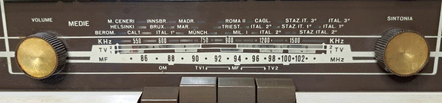 Superheterodyne receiver with broadcast reception, Frequency Modulation, and TV audio divided into two VHF bands. The radio uses six miniature Noval series vacuum tubes: ECC85, ECH81, EF89, EABC80, EL84, and UY85. The AM IF is 468 kHz, and the FM IF is 10.7 MHz. Band switching is via a four-button keypad: MW, TV1, MF, and TV2. The various circuit components are mounted on a printed circuit board. The cabinet is made of two-tone plastic with a rectangular dial on the lower part of the front panel. The speaker is an elliptical magnetodynamic type. The volume and tuning knobs are located respectively to the left and right of the dial, while the keypad is in the middle. The radio is powered by an autotransformer, so one end of the power supply is connected to the chassis. The mains voltage can be selected from 120, 140, 160, 180, and 220 VAC. The radio's dimensions are 15 x 7.9 x 6.7 inches and it weighs 6 lb 9.7 oz. IK3HIA © 2016 - 2025. |