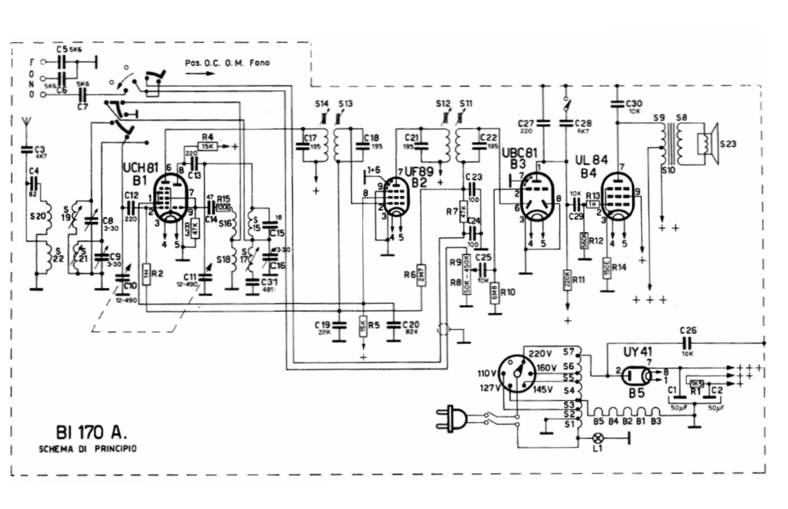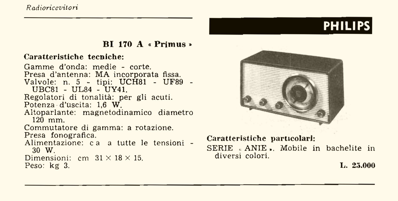 Superheterodyne receiver produced by Philips in the second half of the 1950s in Italy. The BI-170A receives broadcast and short wave, and uses four noval (miniature nine-pin) vacuum tubes: UCH81, UF89, UBC81, UL84 and a rimlock rectifier: UY41. The IF frequency is 460 kHz, and the radio's components are mounted on a printed circuit board. The cabinet is made of plastic, the speaker is a magnetodynamic type of 4.72 inch, the dial is round, and the lower part of the front panel contains the volume, tone, band shift, and tuning controls. The dial is illuminated by a bulb hidden behind the Philips logo. The rear panel features antenna and ground sockets, a phono socket, and a mains power switch with selectable voltages of 110, 127, 145, 160, and 220 Vac. Power is supplied via an autotransformer, so one end of the mains is connected to the chassis. Dimensions: 12.2 x 7.1 x 5.9 inches. IK3HIA © 2005 - 2025. |