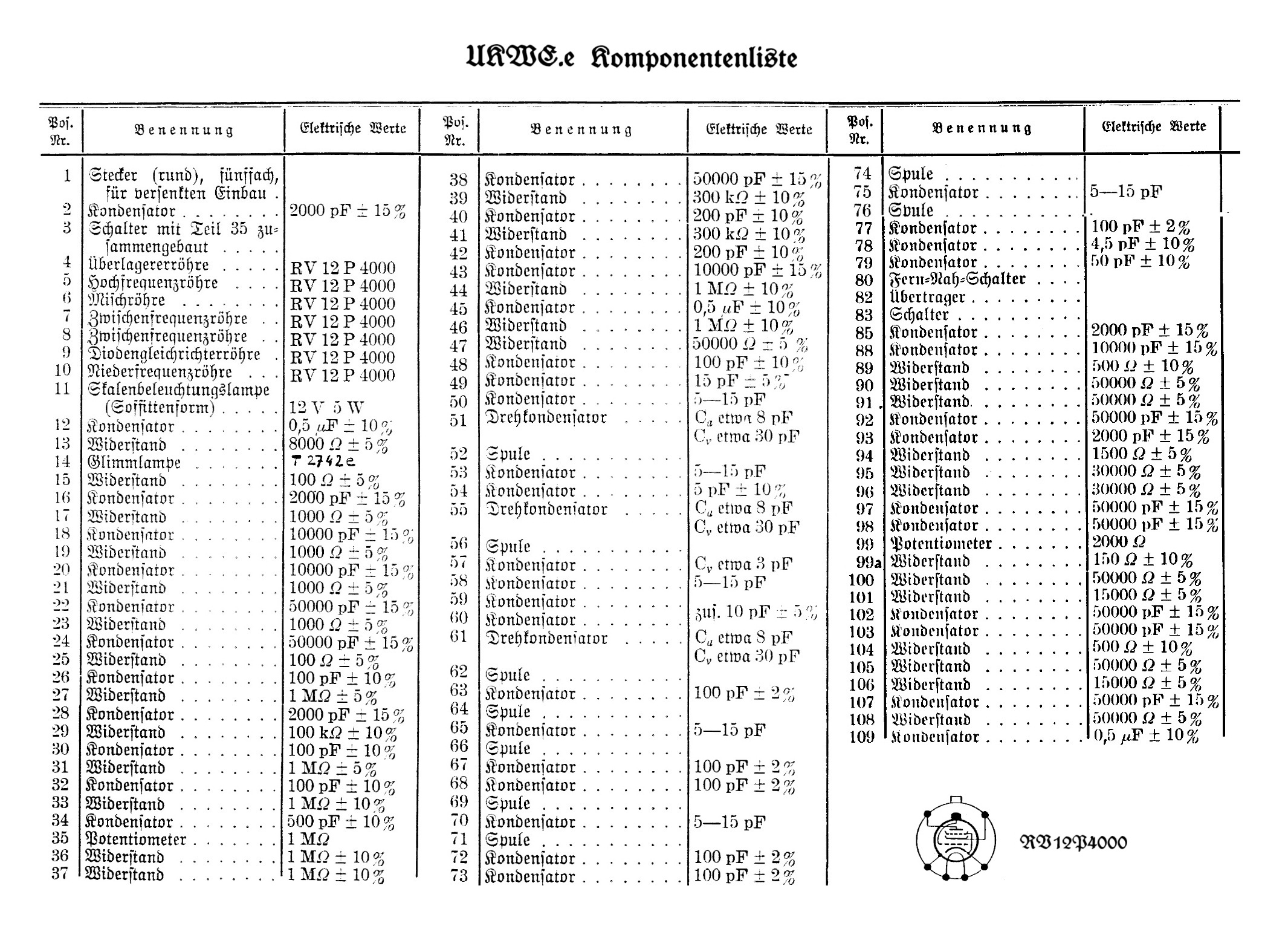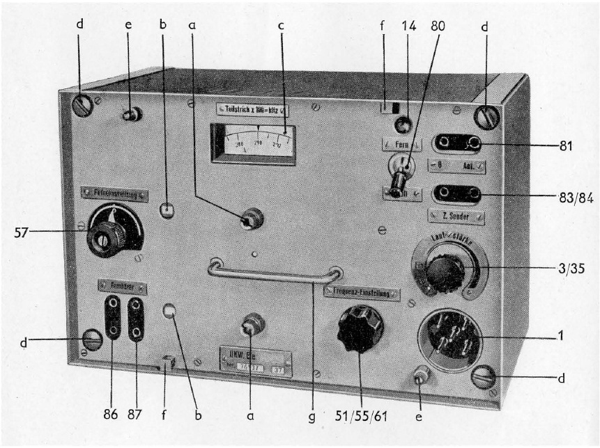 1943This receiver was used by the German Army (Wehrmacht) during World War II. The Emily was the standard receiver installed from 1940 on Panzer IIIs, Panzer IV Ausf AAs up to the H-J models, and on later Tiger, Panther, and other vehicles. The example shown in the photos, complete with original headphones, dates back to 1943. The operating range of the UKWEe was from 27.2 to 33.3 MHz in the A3 (amplitude-modulated telephony) and A2 (wave-modulated telegraphy) reception modes. The circuit was a superheterodyne using seven RV12P4000 tubes and a T2742e voltage regulator. The whip antenna on the tank was 2 meters long, the intermediate frequency was 3000 kHz, and the radio's final stage could drive a pair of 2000-ohm Dfh.b headphones. The radio's dimensions were 7.8 x 12.3 x 6.9 inches, and it weighed 24 lb 3.7 oz. The E.U.a type power supply was connected to the tank's electrical system and supplied the radio with 12 V 1.8 A for the filaments and 135 Vdc 25 mA (via a booster) for the anode. The receiver was used in the tanks together with the model 10W.S.c. transmitter. IK3HIA © 2016 - 2025. |