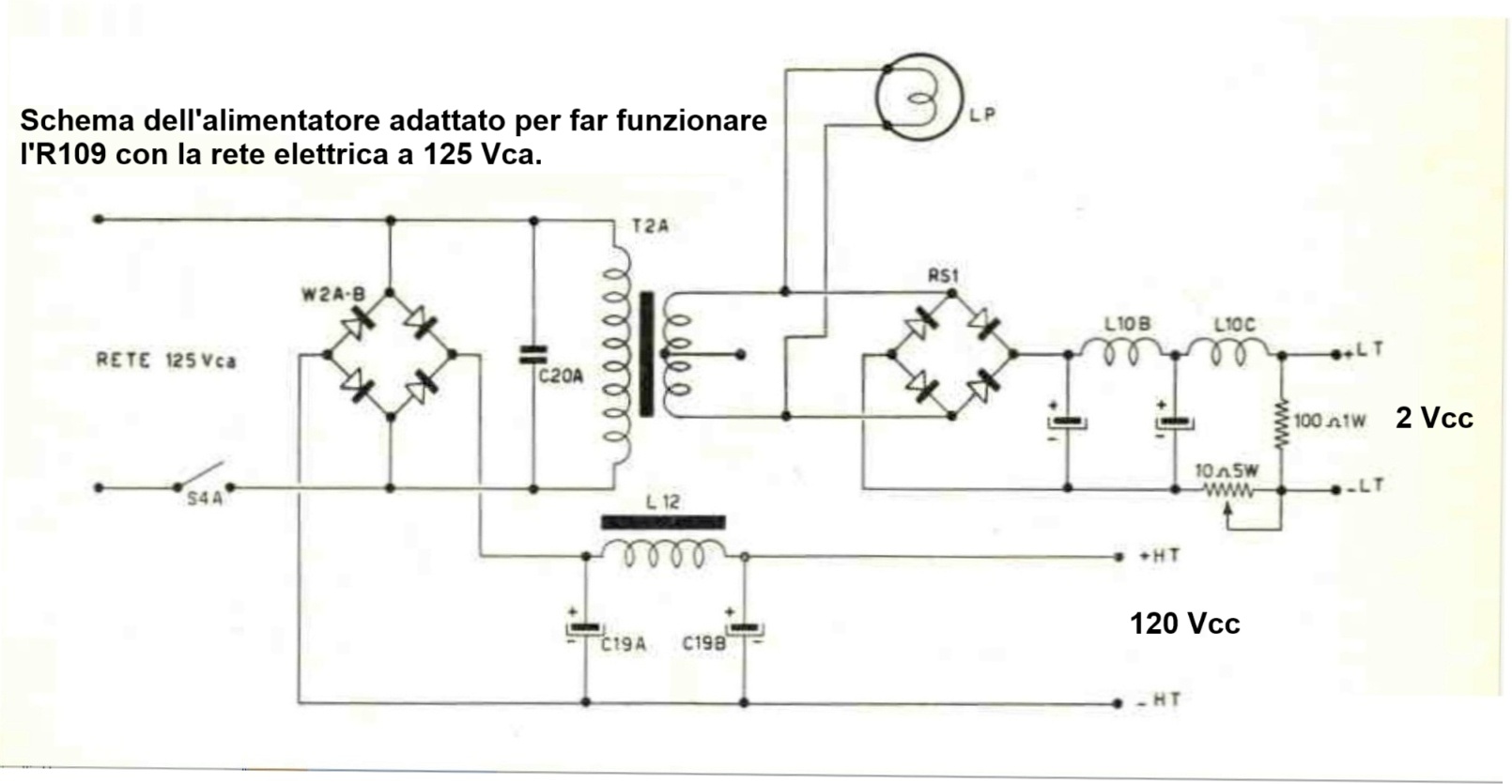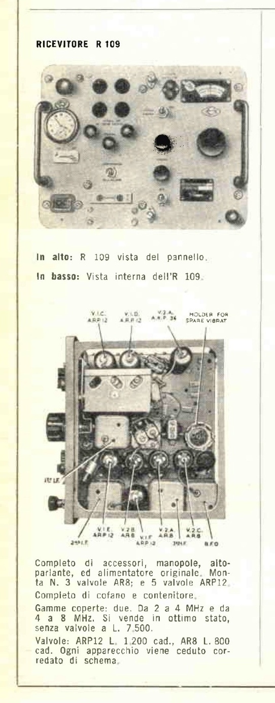 Inghilterra 1940.L'R109 č un ricevitore utilizzato su veicoli e in stazione fissa dall'esercito inglese durante la II Guerra Mondiale. La copertura di frequenza č da 1,8 a 9 MHz suddivisa in due gamme: la prima da 1,8 a 3,9 MHz e la seconda da 3,9 a 8,5 MHz. le modalitą di ricezione sono AM e CW (telegrafia non modulata). Questo ricevitore ha avuto tre versioni successive: l'R-109A, l'R109B e l'R109C che differiscono dal 109 per alcune minime differenze sulla copertura in frequenza e per le valvole utilizzate. Il circuito č una supereterodina con singola conversione a 465 kHz. Le valvole utilizzate sono tutte con zoccolo octal tipo Mazda, con filamento a 2 Vcc e riscaldamento diretto: cinque sono delle ARP12 e tre sono delle AR8. L'alimentazione originale č a batteria tipo autoveicolo da 6 volt con un survoltore a multivibratore per realizzare la tensione anodica. L'ascolto avviene tramite altoparlante (escludibile) o con le cuffie. Questo ricevitore inglese fu utilizzato fino al 1960 anche dal ricostituito esercito italiano al quale, nel 1946, erano state cedute forti aliquote di attrezzature radio e telefoniche smesse dagli alleati dopo la Seconda Guerra Mondiale. Successivamente tali apparecchiature furono dismesse anche dagli italiani e a partire dal 1961, sul mercato del surplus assieme al resto apparvero anche moltissimi esemplari dell'R109. Visto il basso prezzo queste radio furono acquistate da molti squattrinati radiantisti (come me) che in tal modo poterono entrare in possesso di un discreto ricevitore che, dopo la modifica all'alimentazione, poteva coprire le bande radioamatoriali degli 80 e dei 40 metri, con ricezione di segnali in AM e in CW (e con un po' di pazienza anche in SSB) grazie al B.F.O. IK3HIA © 2004. |