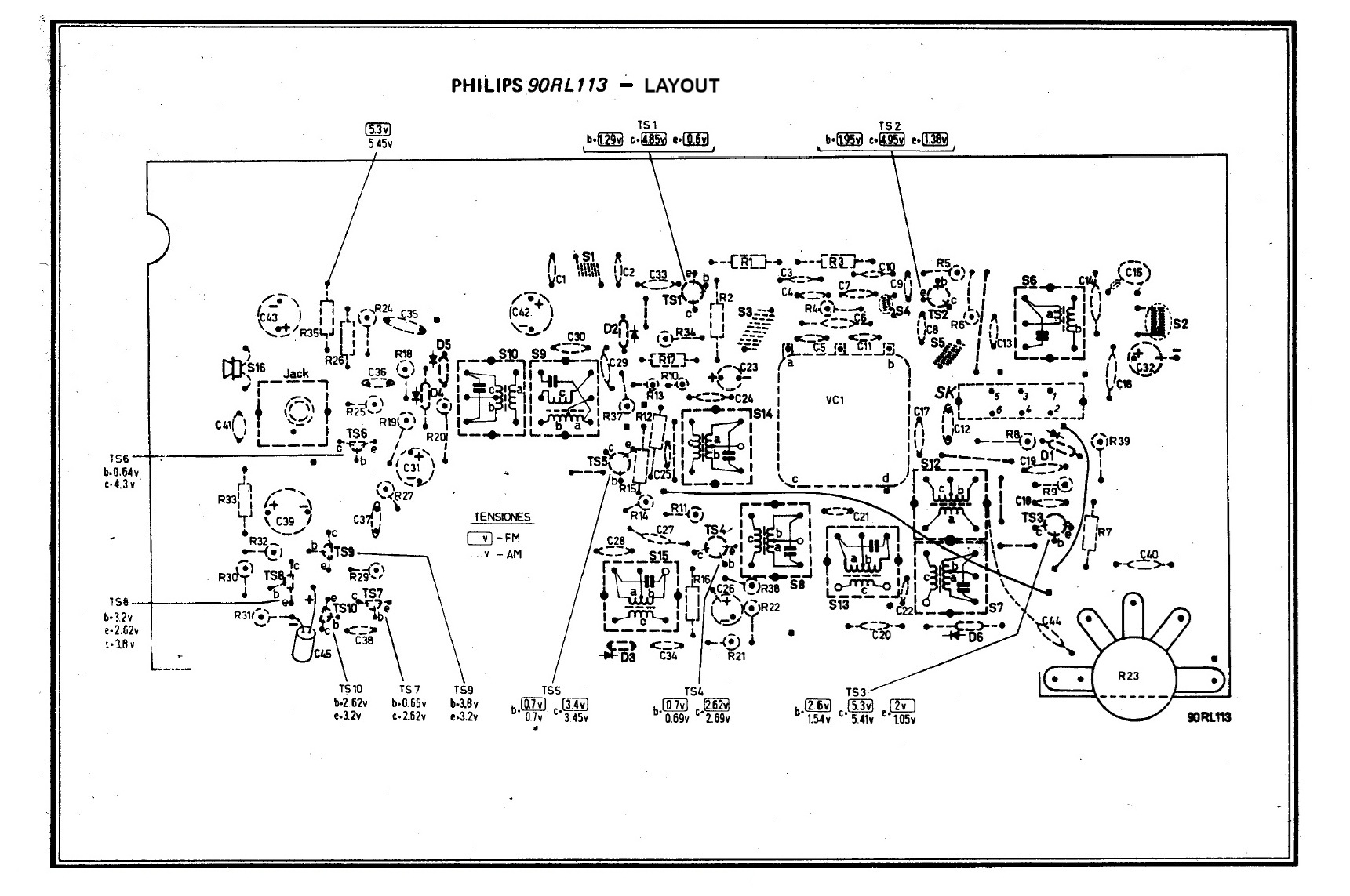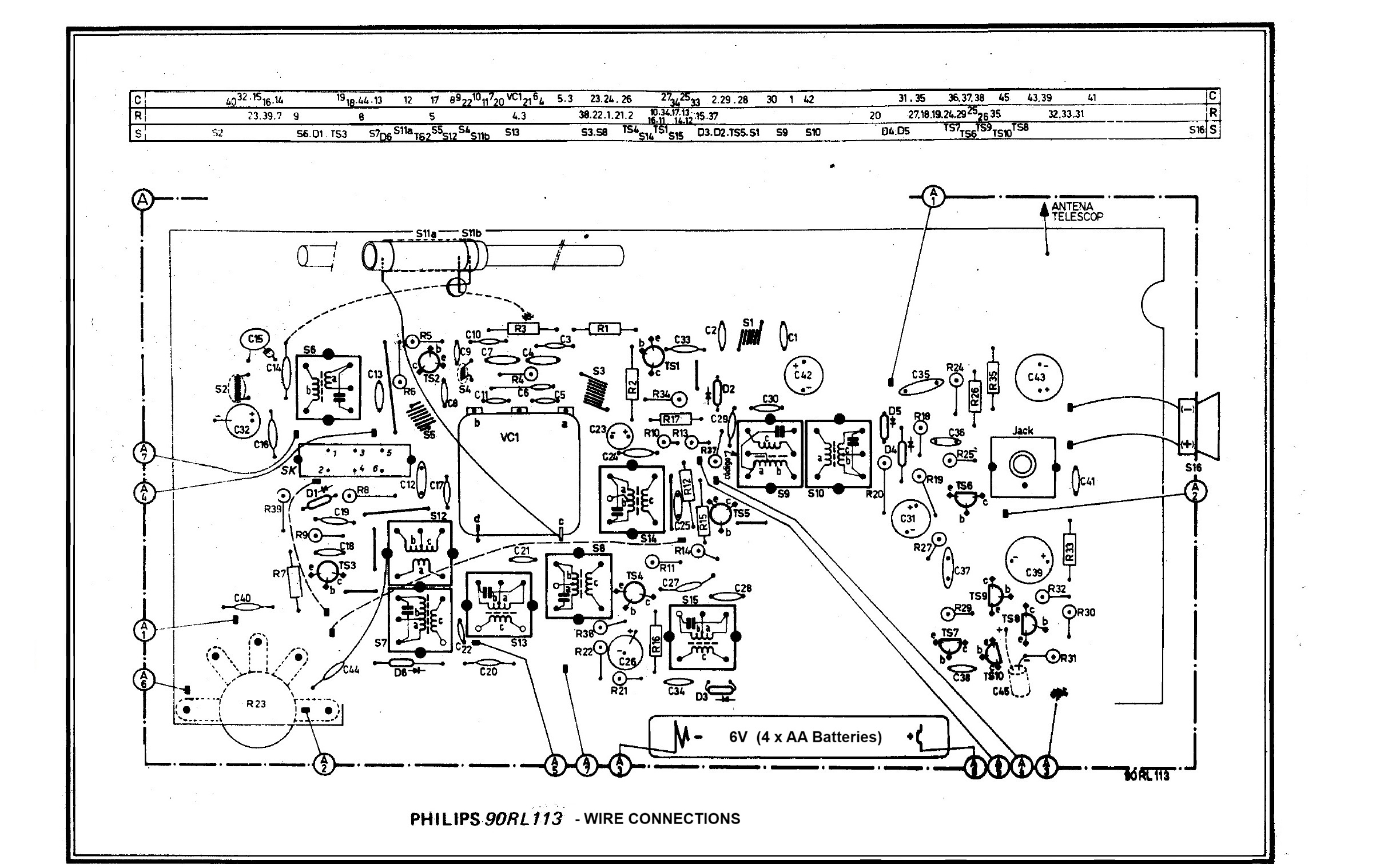 90RL113-68 - PHILIPS S.p.A. Via Casati 22 - Monza, Italy.The 90RL113 is a portable superheterodyne receiver produced in the early 1970s by Philips Italia, capable of receiving MW (530 to 1630 kHz) and FM (85.5 to 104 MHz) frequencies. The same model was produced in other Philips factories located in various European countries. The receiver uses nine silicon transistors, eight of which are NPN and one PNP for the audio power supply. It features two antennas: a 18.898 in long whip antenna for FM and a ferroxcube antenna for AM. AM-FM switching is achieved via a slide switch on the rear panel. The radio's audio stage is of the complementary symmetry type with an output power of 275 mW on a 2.2 inch elliptical magnetodynamic speaker. The rear panel features a headphone jack. The radio is powered by four 1.5 V AA batteries (for a total of 6 VDC). The cabinet is made of plastic with a dial that extends across the entire upper part of the front panel. The power/volume and tuning knobs are on the right side. Dimensions are 6.7 x 3.9 x 3 in, and the weight without batteries is 1 lb 1.6 oz. IK3HIA © 2026. |