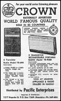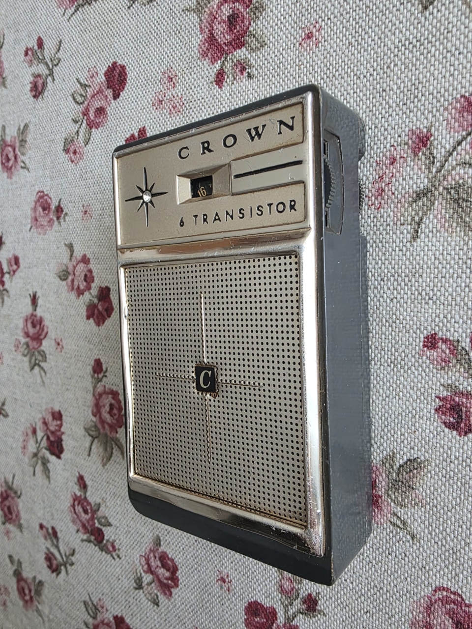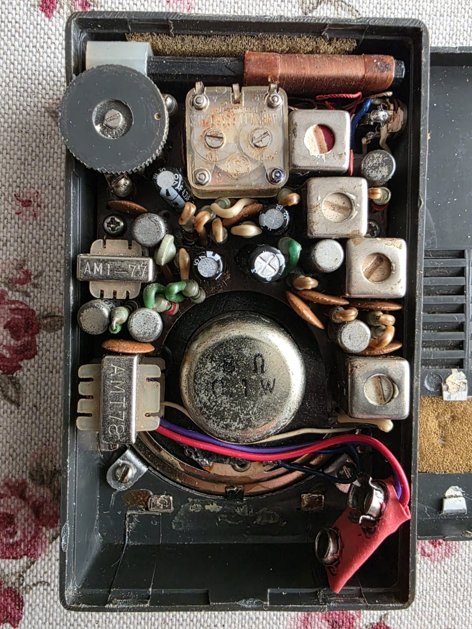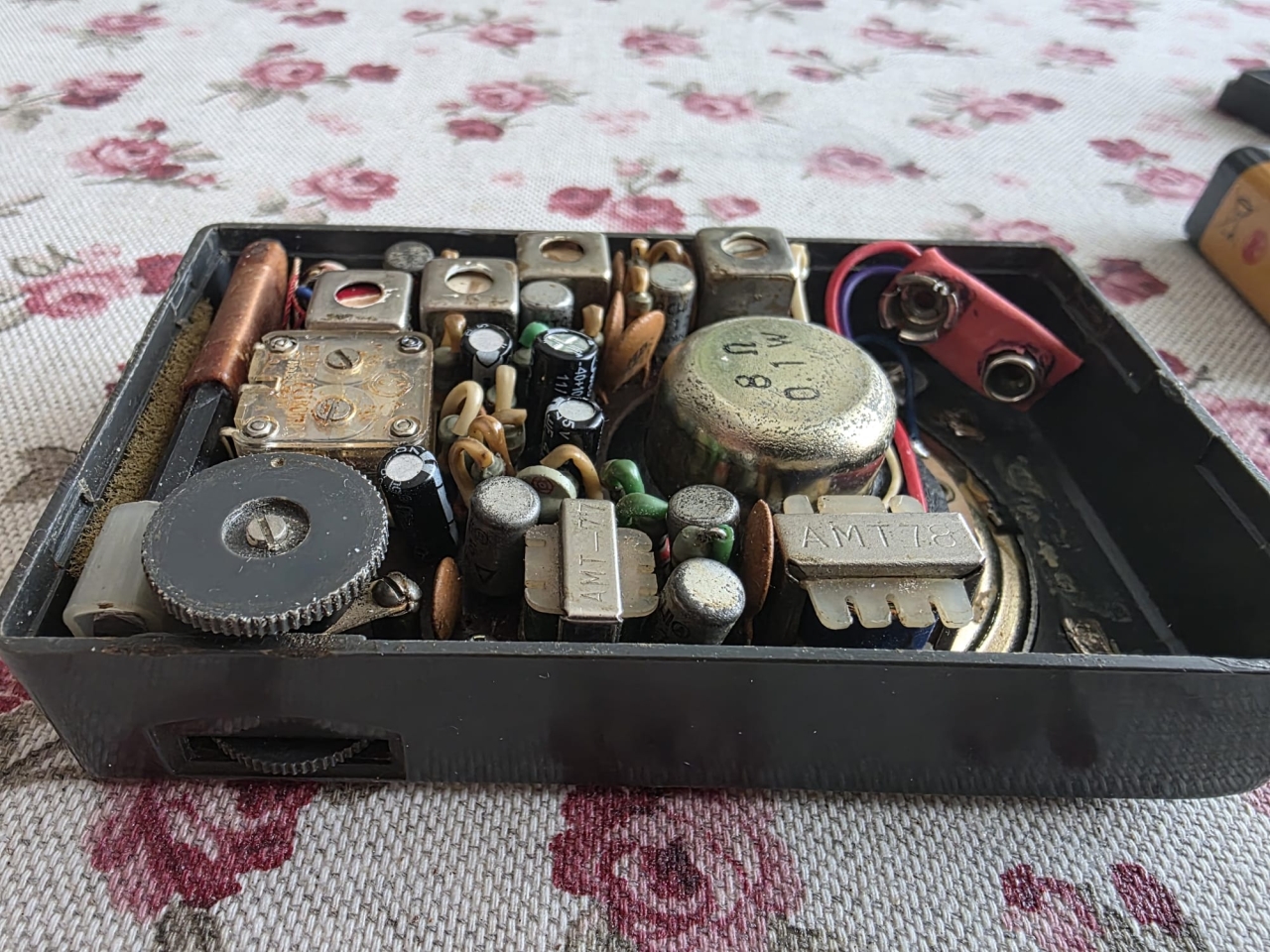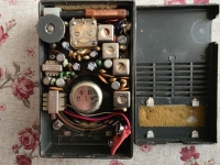 Crown Radio Corp. Okinawa, Japan ~1961.Radio tascabile con ricezione delle Onde Medie prodotto in Giappone dalla Crown Radio Corp. all'inizio degli anni '60. La radio riceve le gamme AM (da 535 a 1605 kHz) con circuito supereterodina che utilizza sei transistor al germanio (2SA102, 2SA101, 2SA101, 2SB171, 2SB172 e 2SB172) e un diodo al germanio. La Frequenza Intermedia risuona a 455 kHz. L'antenna è una bobina avvolta su un nucleo di ferrite piatto. Il cabinet è in plastica con la griglia frontale in metallo forato per l'altoparlante e i bordi cromati. La potenza audio in uscita è di 100 mW su un altoparlante magnetodinamico da Ø 5,5 cm e impedenza 8 Ohm. La scala parlante analogica della radio consiste in una finestrella sulla parte alta del frontale con a lato la manopola di sintonia. Siccome la radio veniva commercializzata negli USA all'inizio degli anni '60, sulla scala parlante erano serigrafati due triangolini in corrispondenza delle due frequenze del CONERAD, il sistema di allarme atomico USA. Per maggiori informazioni vedere qui la pagina relativa. Sempre sul lato destro del mobile, affiancata alla manopola della sintonia, c'è quella dell'interruttore-volume, sul lato opposto invece c'è la presa per l'auricolare. L'alimentazione è fornita da una batteria a secco da 9 Vcc (tipo 6F22 o Eveready N.216). Le dimensioni sono: 6 x 10,5 x 2,5 cm, e il peso è di 400 g senza la batteria. Per ripristinare il funzionamento della radio è stato sufficiente sostituire i quattro condensatori elettrolitici presenti nel circuito. Non avendo a disposizione lo schema elettrico ho dissaldato le quattro capacità originali e le ho sostituite con componenti moderni di simile valore ma con superiore tensione di isolamento. IK3HIA © 2026. |