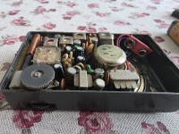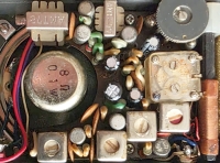 Special table or portable alarm clock radio with LCD clock made in China and marketed in Italy under the Parsons Int. brand. The radio receives broadcast in AM (535-1605 kHz) with a superheterodyne circuit using 6 germanium transistors (2SA102, 2SA101, 2SA101, 2SB171, 2SB172 and 2SB172). The antenna is a coil wound on a flat ferrite core, The cabinet is made of plastic with a metal grille front for the speaker and chrome edges. The audio power output is 100 mW on a magnetodinamic Ø 2.2 inch and 8 Ohm impedence speaker. The radio's analog dial consists of a small window at the top of the front panel with the tuning knob next to it. Since the radio was marketed in the USA in the early 1960s, two small triangles were silkscreened on the dial corresponding to the two frequencies of CONERAD, the US nuclear warning system. For more information, see here the relevant page. Also on the right side of the cabinet, next to the tuning knob, is the volume/off-on switch; on the opposite side is the earphone jack. Power is supplied by a 9 VDC dry cell battery (type 6F22 or Eveready No. 216). Dimensions are 2.4 x 4.1 x 1 inch, and the weight is 0 lb 14.1 oz without the battery. To restore the radio's functionality, I simply replaced the four electrolytic capacitors in the circuit. Since I didn't have the wiring diagram available, I unsoldered the four original capacitors and replaced them with modern components of similar value but with a higher insulation voltage. IK3HIA © 2026. |